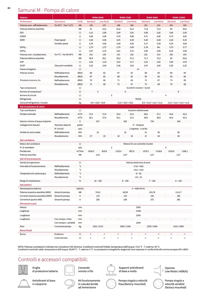 NOTA: Potenza e prestazioni indicate non includono il kit idronico. Condizioni nominali freddo: temperatura dell'acqua: 7/12 °C - T. esterna: 35 °C.