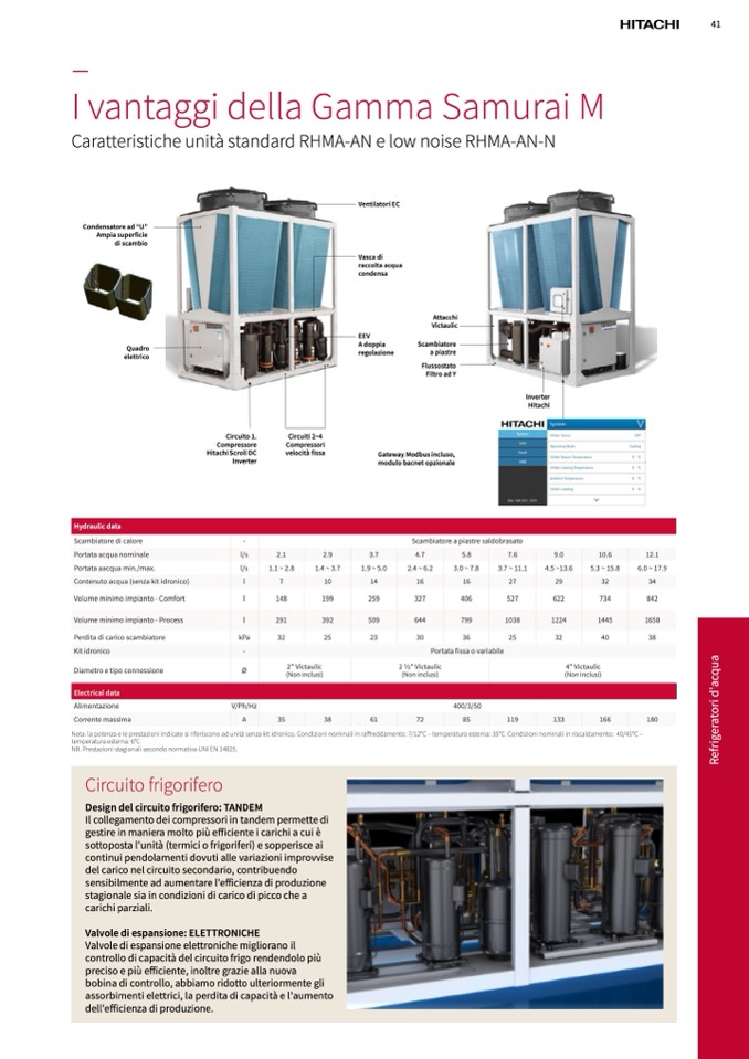 Nota: la potenza e le prestazioni indicate si riferiscono ad unità senza kit idronico. Condizioni nominali in raffreddamento: 7/12°C – temperatura esterna: 35°C. Condizioni nominali in riscaldamento: 40/45°C –