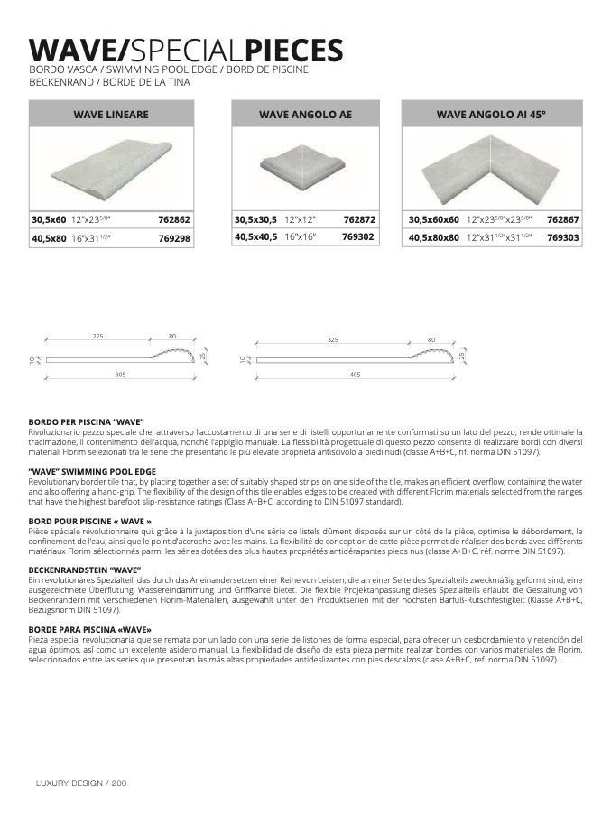Beckenrändern mit verschiedenen Florim-Materialien, ausgewählt unter den Produktserien mit der höchsten Barfuß-Rutschfestigkeit (Klasse A+B+C
