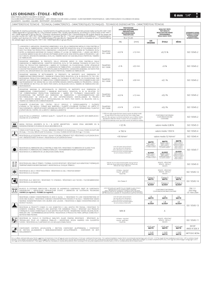 chaften nach Normen EN 14411-ISO 13006 Anhang G Gruppe BIa GL / Baldosas de cerámica rensadas en seco. Característica