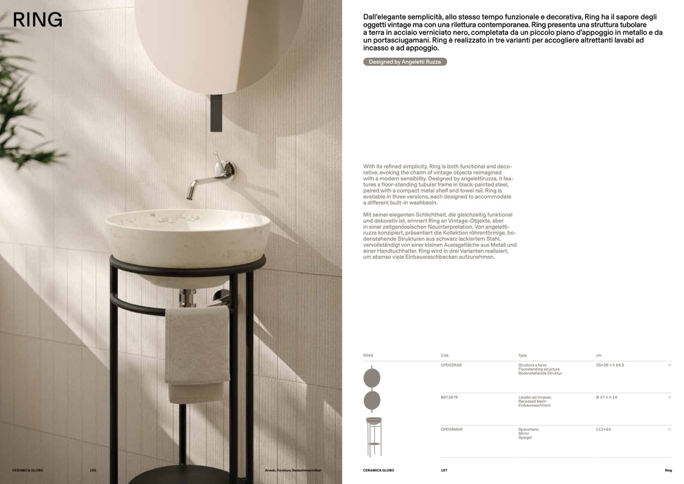 un portasciugamani. Ring è realizzato in tre varianti per accogliere altrettanti lavabi a
