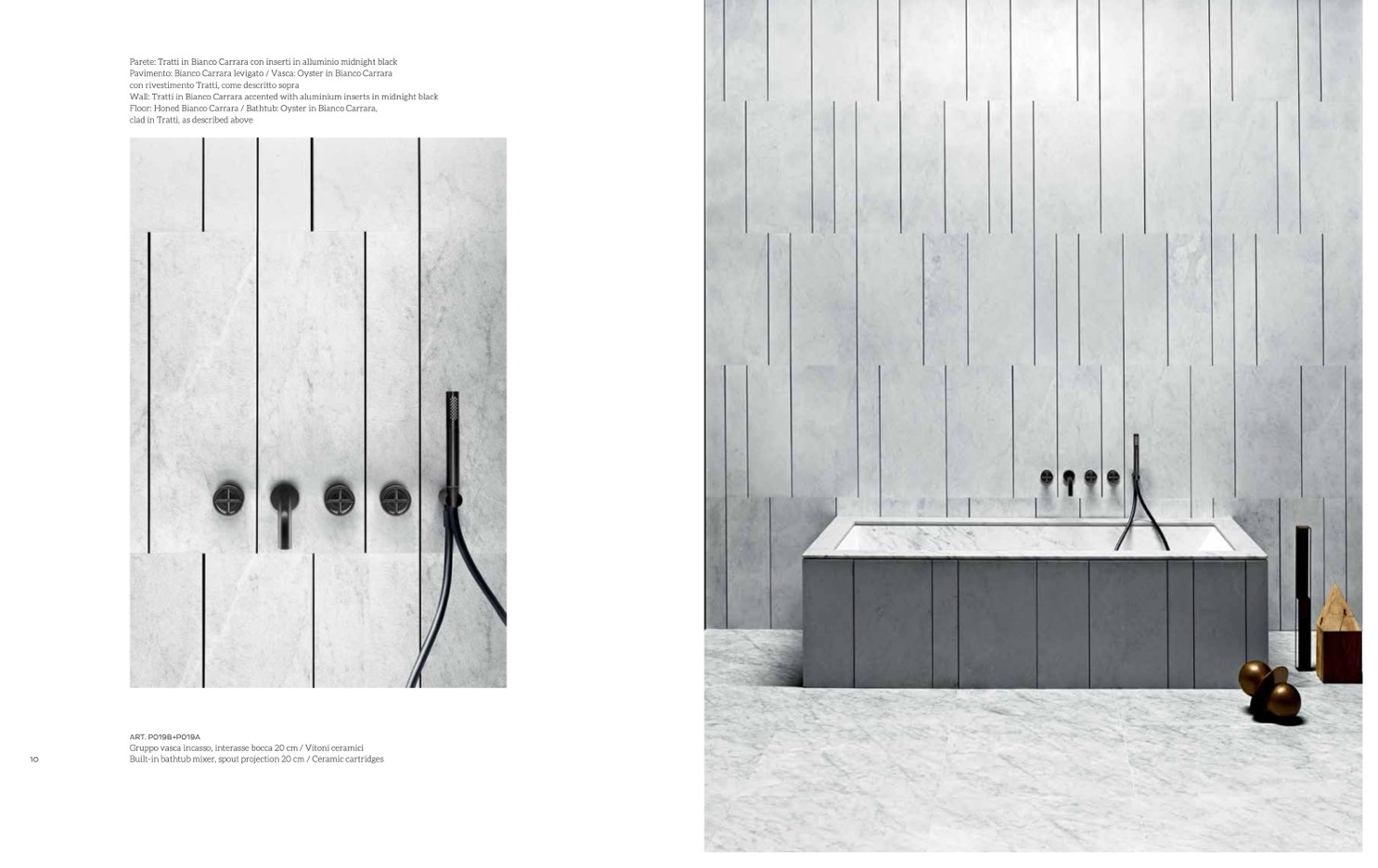 Wall: Tratti in Bianco Carrara accented with aluminium inserts in midnight black
