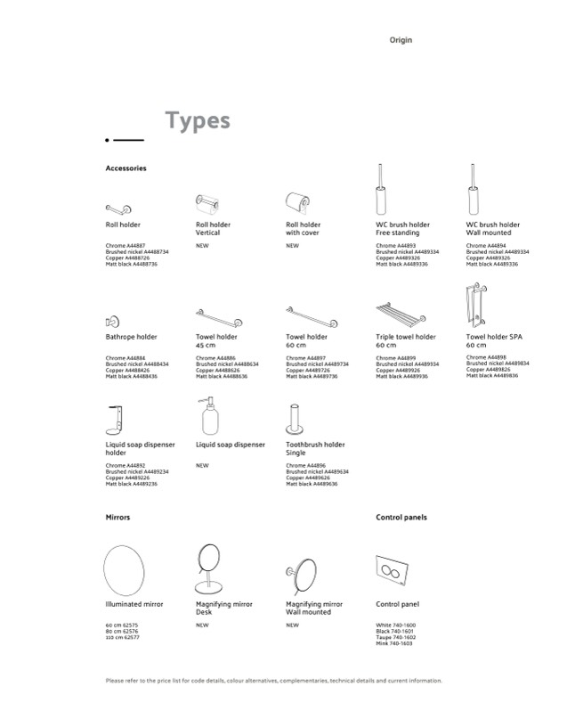 Please refer to the price list for code details, colour alternatives, complementaries, technical details and current information.