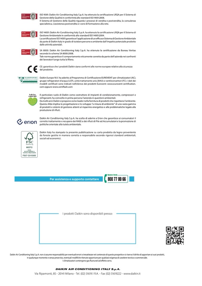 Daikin Air Conditioning Italy S.p.A. non si assume responsabilità per eventuali errori o inesattezze nel contenuto di questo prospetto e si riserva il diritto di apportare ai suoi prodotti,
