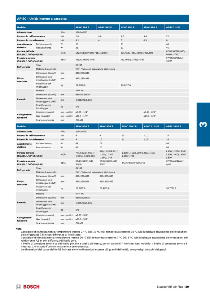 Condizioni di raffrescamento: temperatura interna 27 °C DB, 19 °C WB; temperatura esterna 35 °C DB; lunghezza equivalente delle tubazioni