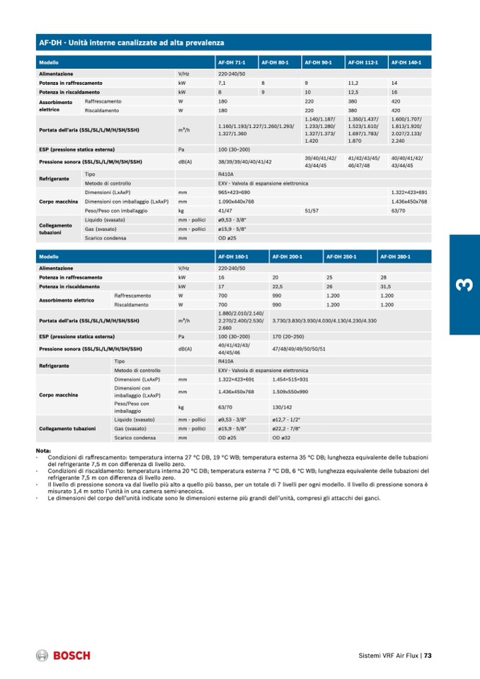Condizioni di raffrescamento: temperatura interna 27 °C DB, 19 °C WB; temperatura esterna 35 °C DB; lunghezza equivalente delle tubazioni