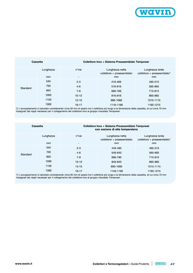 (*) L'accoppiamento è calcolato considerando circa 50 mm di spazio tra il collettore pi