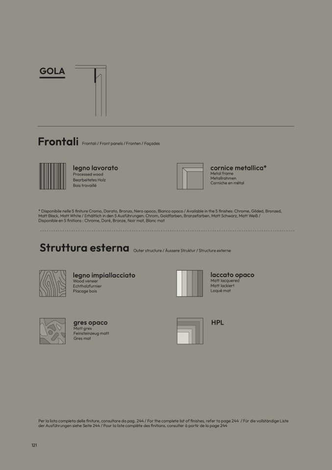 Per la lista completa delle finiture, consultare da pag. 244 / For the complete list of