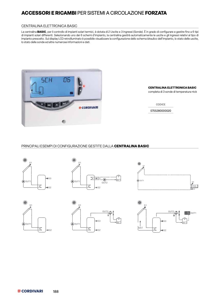 La centralina BASIC, per il controllo di impianti solari termici, è dotata di 2 Uscite e 3 Ingressi (Sonde). È in grado di configurare e gestire fino a 6 tipi