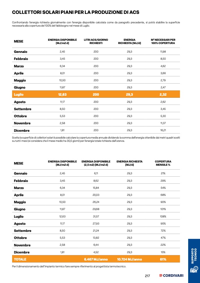 Scelta la superficie di collettori solari è possibile calcolare la copertura media annuale dividendo la somma dell’energia ottenibile dai metri quadri scelti