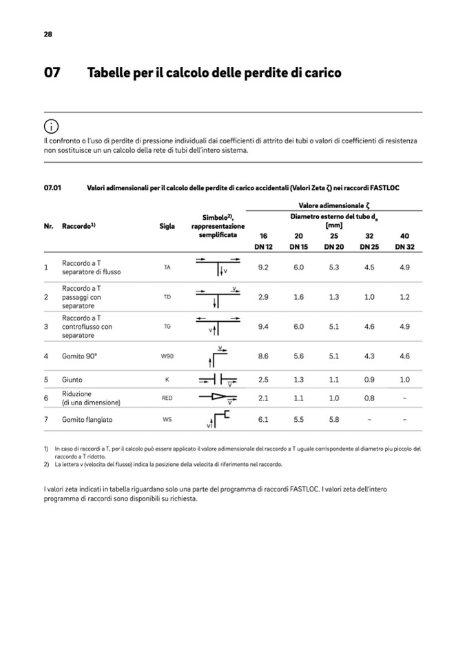 Valori adimensionali per il calcolo delle perdite di carico accidentali (Valori Zeta ζ) nei raccordi FASTLOC