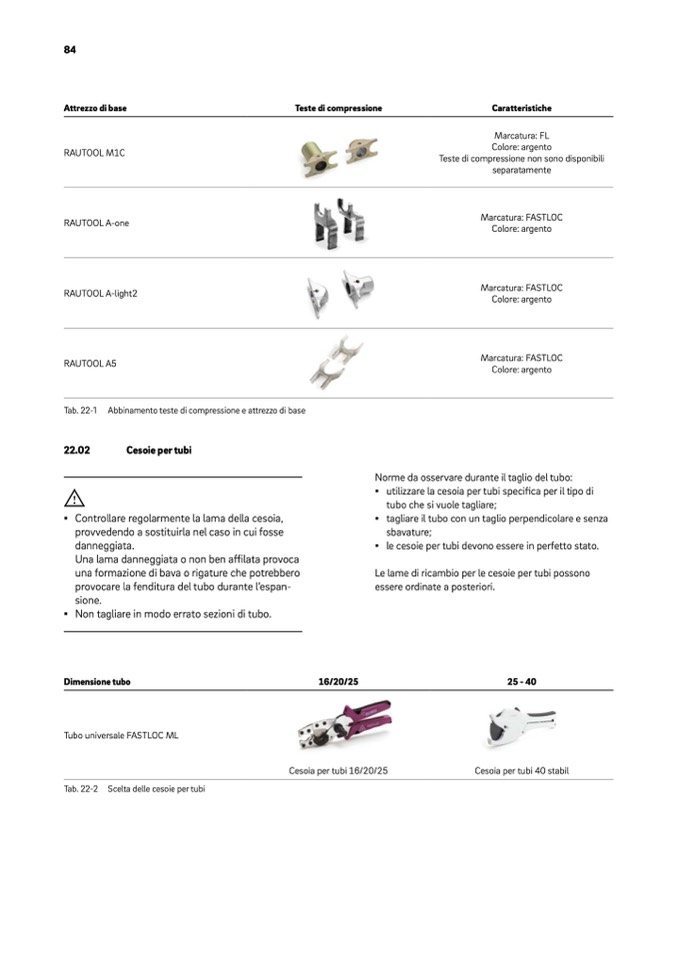 Tab. 22-2 Scelta delle cesoie per tubi