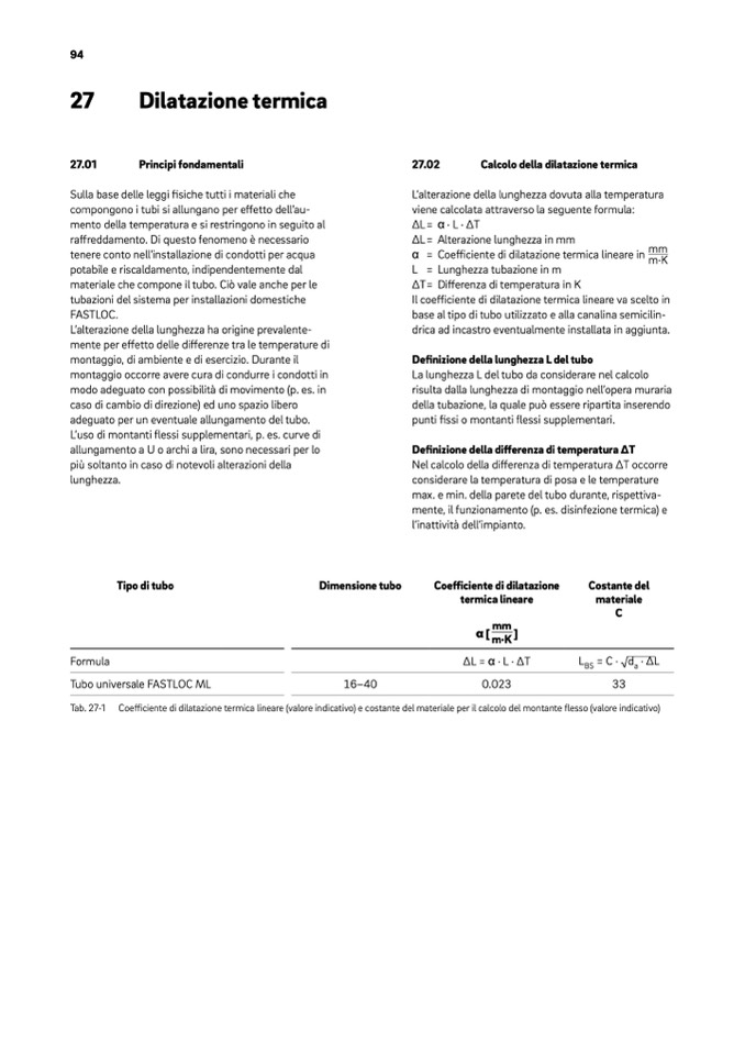 Tab. 27-1 Coefficiente di dilatazione termica lineare (valore indicativo) e costante del materiale per il calcolo del montante flesso (valore indicativo)