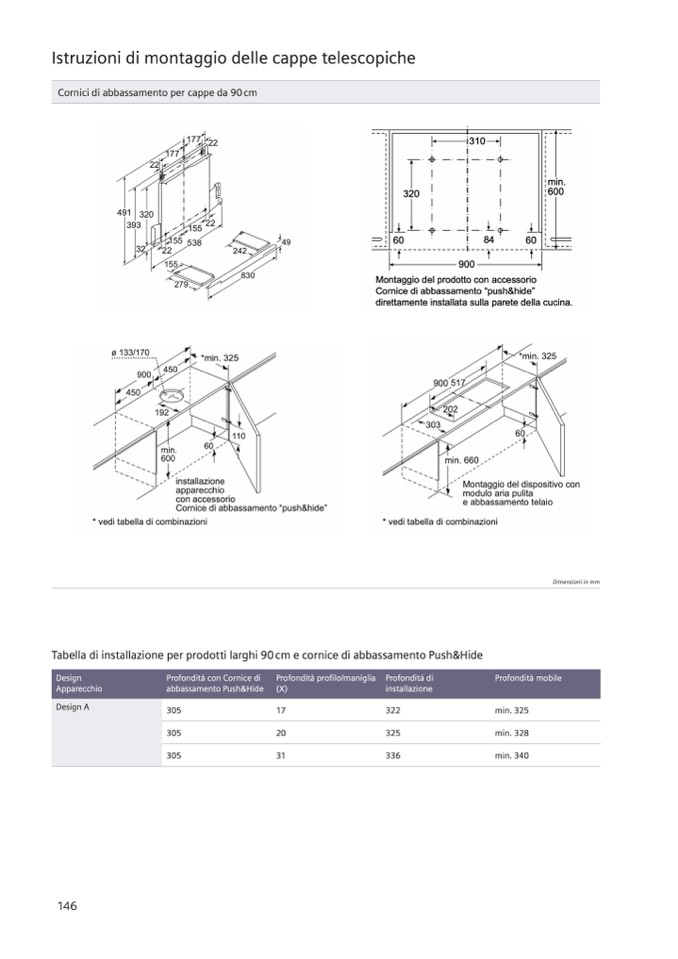 Tabella di installazione per prodotti larghi 90 cm e cornice di abbassamento Push&Hide