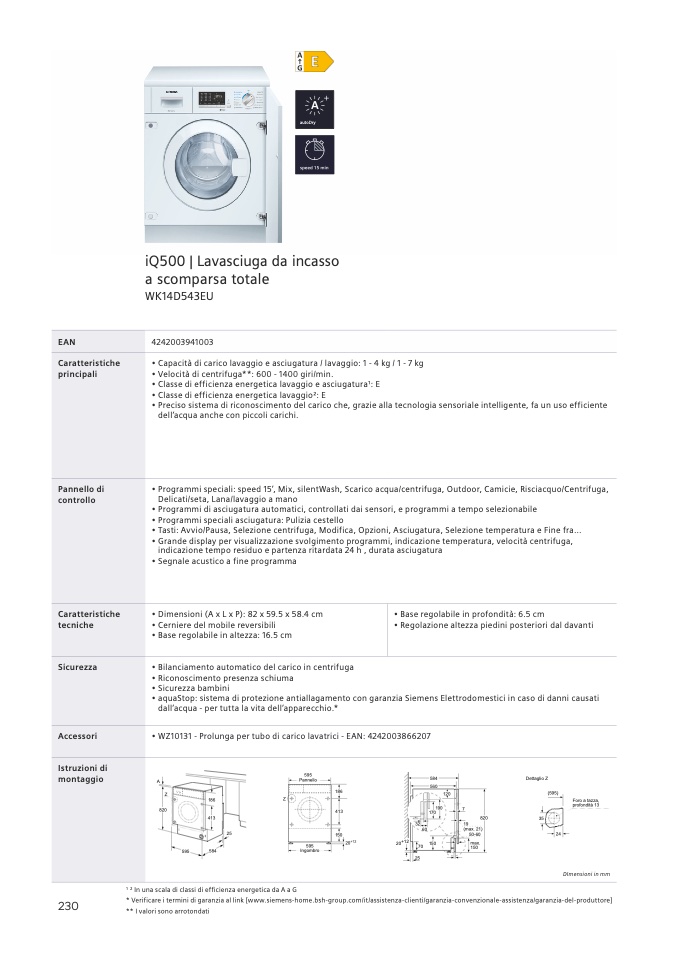 • Classe di efficienza energetica lavaggio e asciugatura1: E