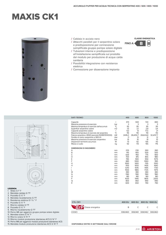 ACCUMULO PUFFER PER ACQUA TECNICA CON SERPENTINO 400 / 600 / 800 / 1000