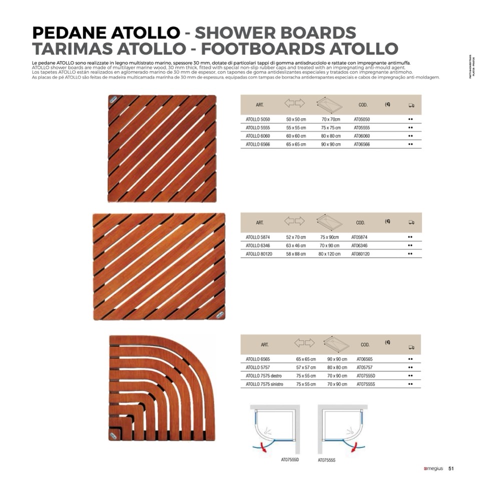 Le pedane ATOLLO sono realizzate in legno multistrato marino, spessore 30 mm, dotate di particolari tappi di gomma antisdrucciolo e rattate con impregnante antimuffa.