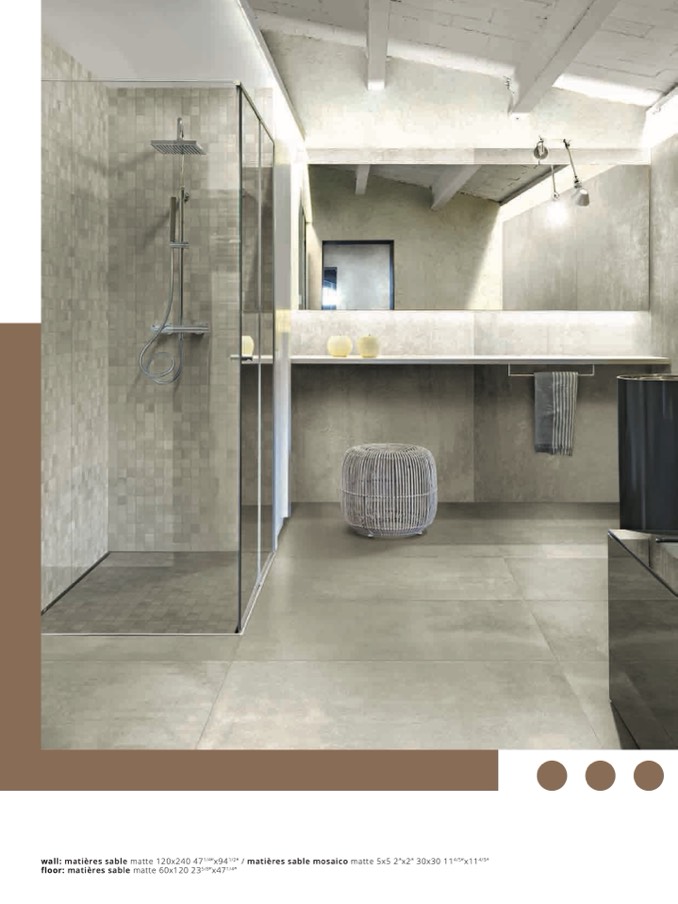 wall: matières sable matte 120x240 471/4”x941/2” / matières sable mosaico matte 5x5 2”x2” 30x30 114/5”x114/5”