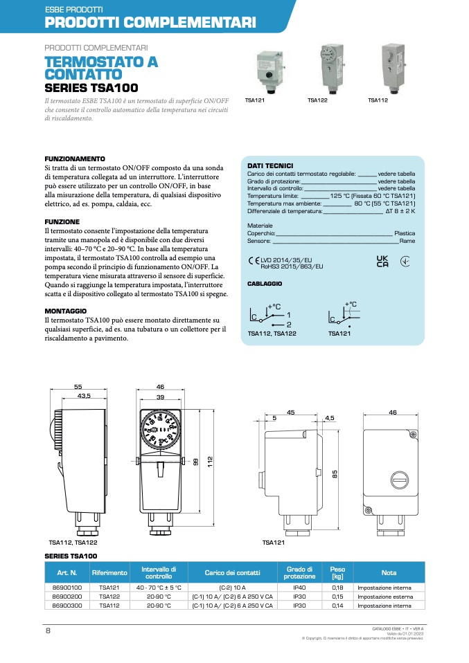 Il termostato ESBE TSA100 è un termostato di superficie ON/OFF