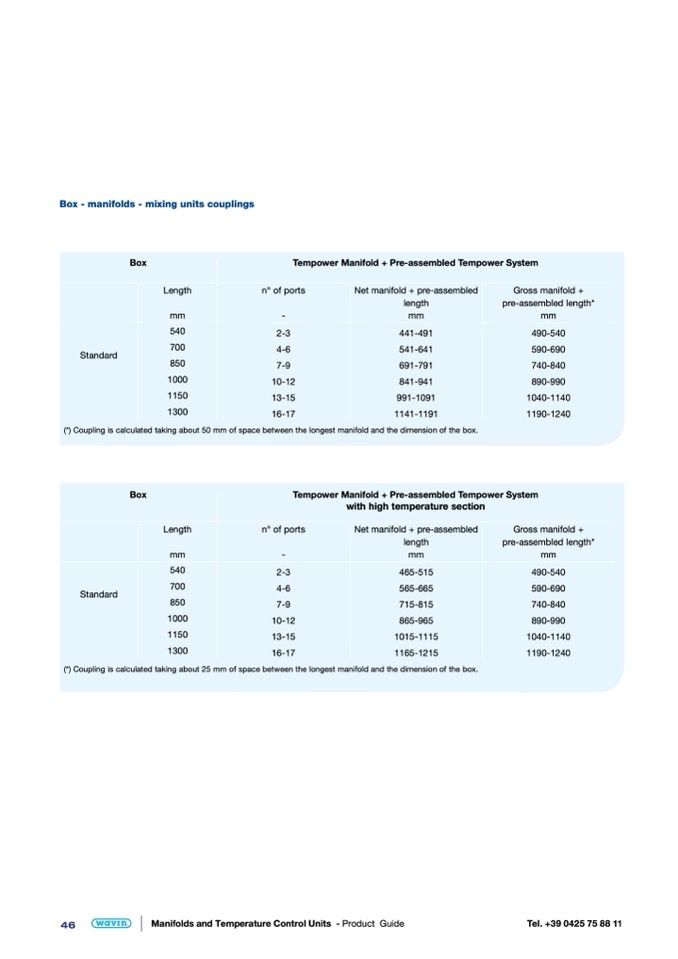 (*) Coupling is calculated taking about 25 mm of space between the longest manifold and the dimension of the box.