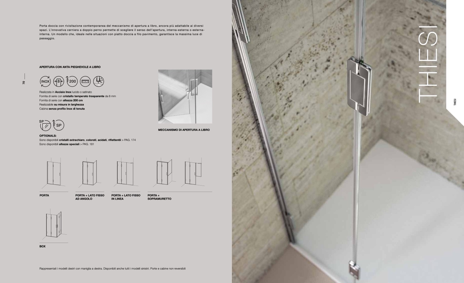 Rappresentati i modelli destri con maniglia a destra. Disponibili anche tutti i modelli sinistri. Porte e cabine non reversibili
