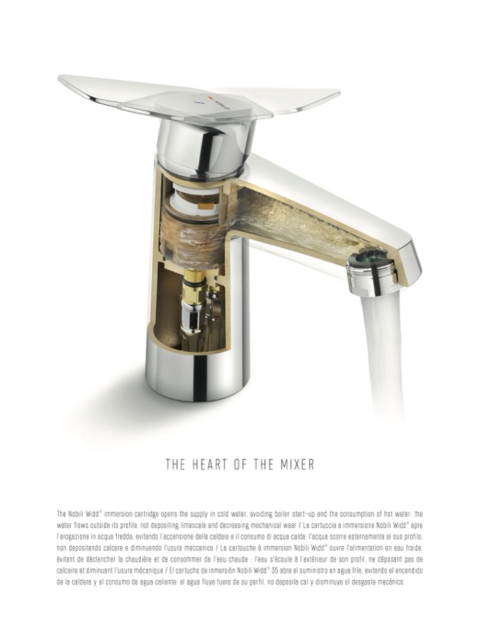 water flows outside its profile, not depositing limescale and decreasing mechanical wear / La cartuccia a immersione Nobili Widd