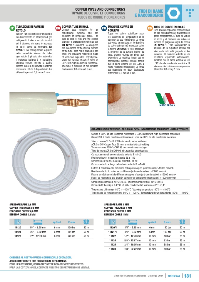 refrigeranti. Il tubo è venduto in rotol
