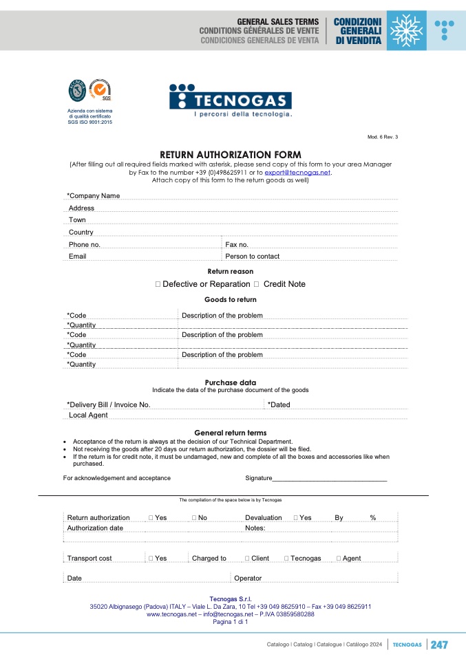 by Fax to the number +39 (0)498625911 or to export@tecnogas.net