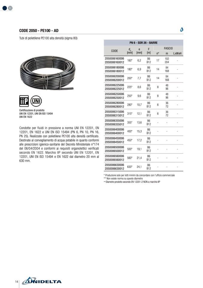 Diametro prodotto secondo EN 12201-2 NON a marchio IIP