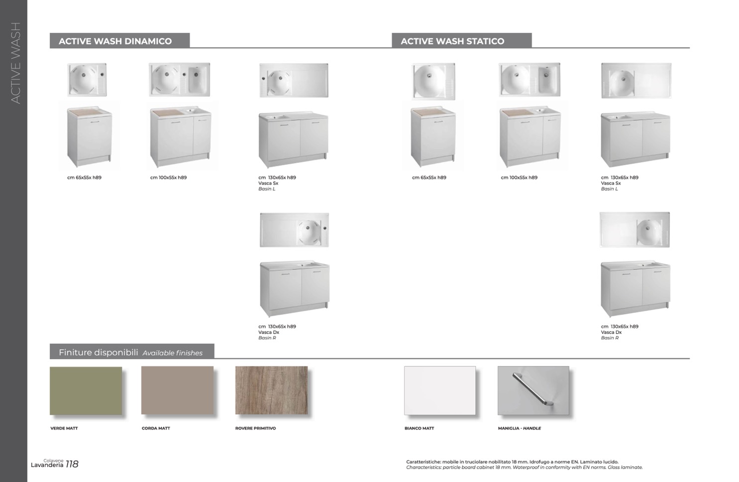 Characteristics: particle board cabinet 18 mm. Waterproof in conformity with EN norms. Gloss laminate.