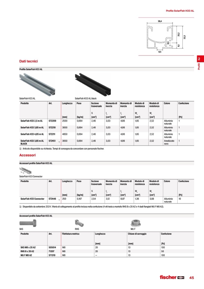 1) Disponibile da settembre 2024. Viteria di collegamento al profilo inclusa nella confezione (4 viti testa a martello RHS 8 x 20 A2 e 4 dadi flangiati MU F M8 A2).