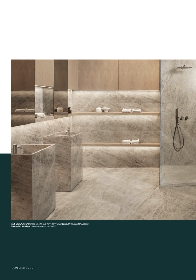 wall: OPAL YAMUNA matte silk 120x280 471/4”x1101/4” washbasin: OPAL YAMUNA gloss