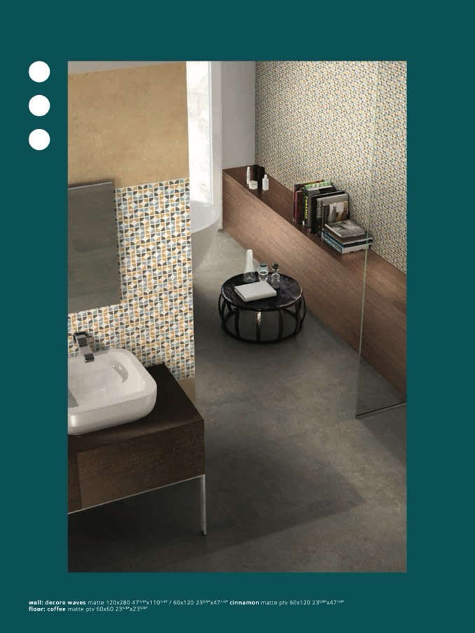 wall: decoro waves matte 120x280 471/4”x1101/4” / 60x120 235/8”x471/4” cinnamon matte ptv 60x120 235/8”x471/4”