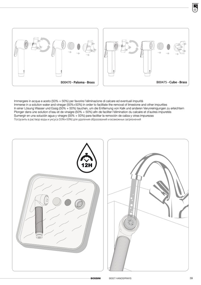 Immergere in acqua e aceto (50% + 50%) per favorire l’eliminazione di calcare ed eventuali impurità