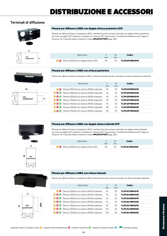 per tubo corrugato D75. Il plenum è completo di 1 attacco D75, 1 guarnizione, 1 forchetta antisfilamento ed 1 tappo di