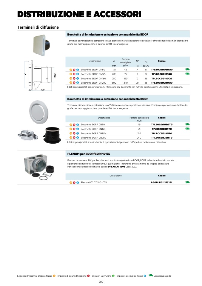 Il plenum è completo di 1 attacco D75, 1 guarnizione, 1 forchetta antisfilamento ed 1 tappo di chiusura.