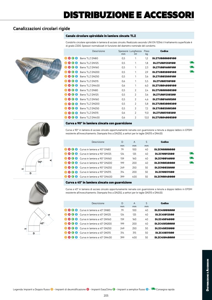 Curva a 45° in lamiera di acciaio zincato opportunamente nervata con guarnizione a tenuta a doppio labbro in EPDM