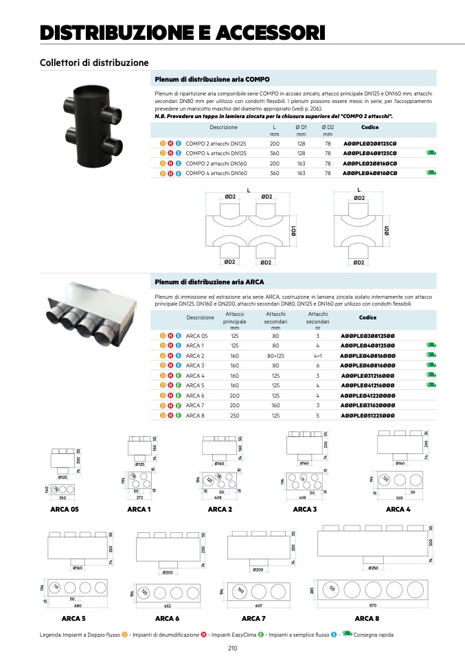 principale DN125, DN160 e DN200, attacchi secondari DN80, DN125 e DN160 per utilizzo con condotti flessibili.