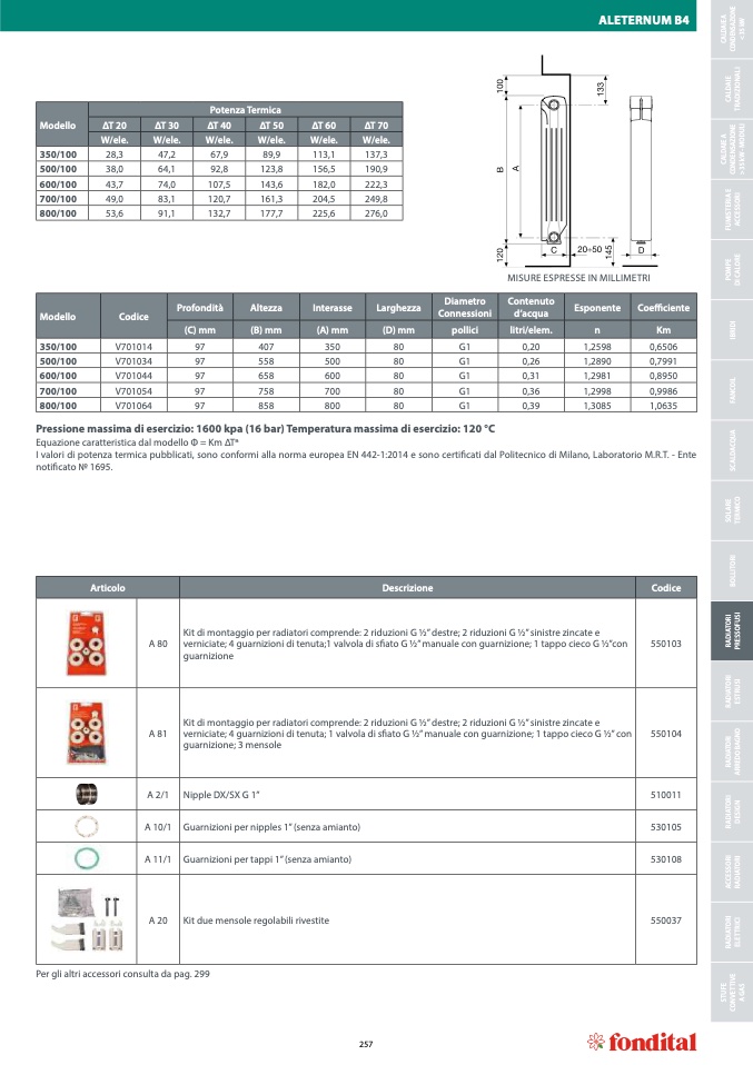 I valori di potenza termica pubblicati, sono conformi alla norma europea EN 442-1:2014 e sono certificati dal Politecnico di Milano, Laboratorio М.R.Т. - Ente