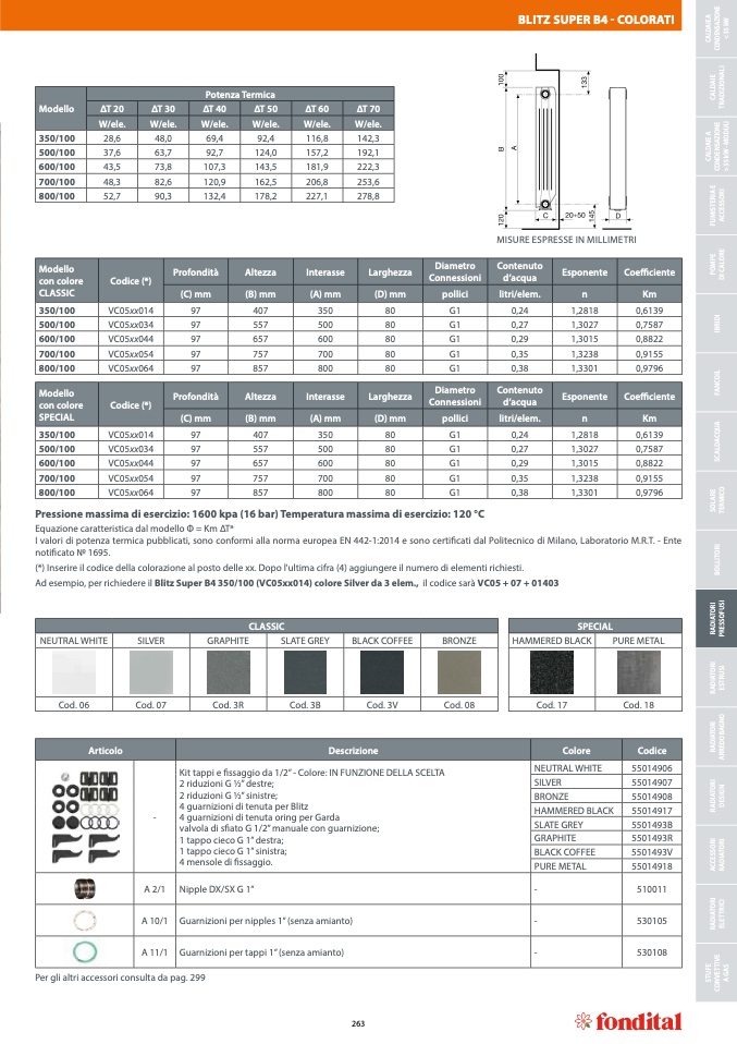 I valori di potenza termica pubblicati, sono conformi alla norma europea EN 442-1:2014 e sono certificati dal Politecnico di Milano, Laboratorio М.R.Т. - Ente