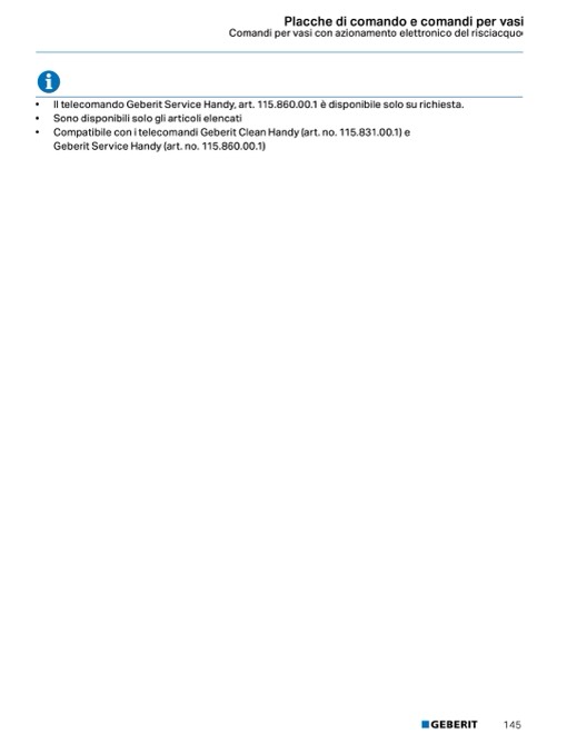 • Compatibile con i telecomandi Geberit Clean Handy (art. no. 115.831.00.1) e