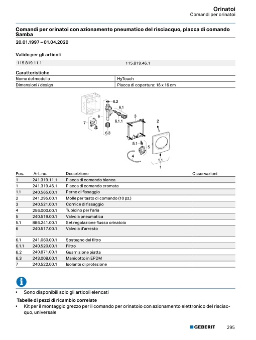 Comandi per orinatoi con azionamento pneumatico del risciacquo, placca di comando