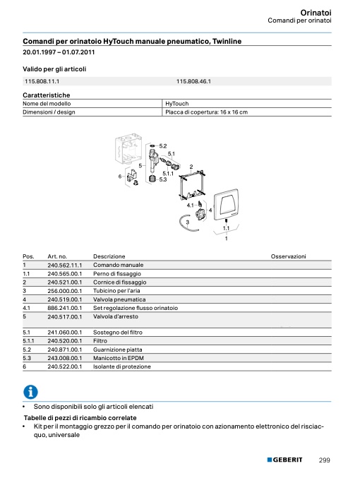 • Comandi WC HyTouch, manuali / pneumatici, risciacquo ad una quantità → pag. 155