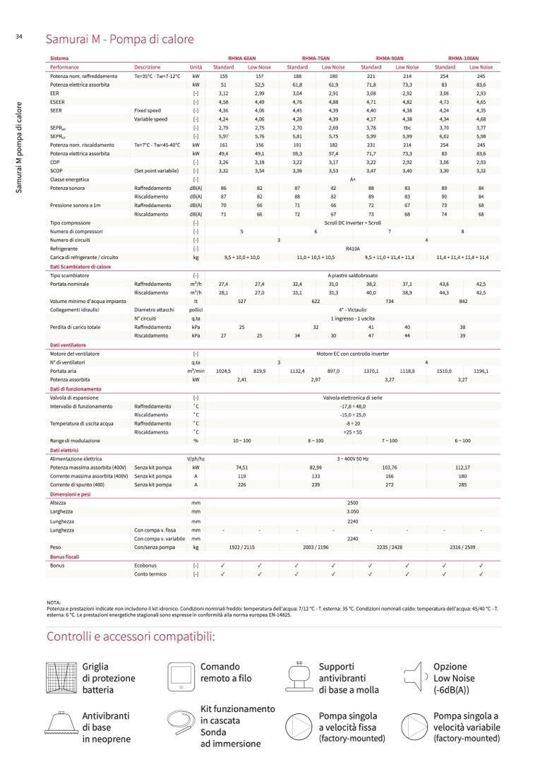 Potenza e prestazioni indicate non includono il kit idronico. Condizioni nominali freddo: temperatura dell'acqua: 7/12 °C - T. esterna: 35 °C. Condizioni nominali caldo: temperatura dell'acqua: 45/40 °C - T.