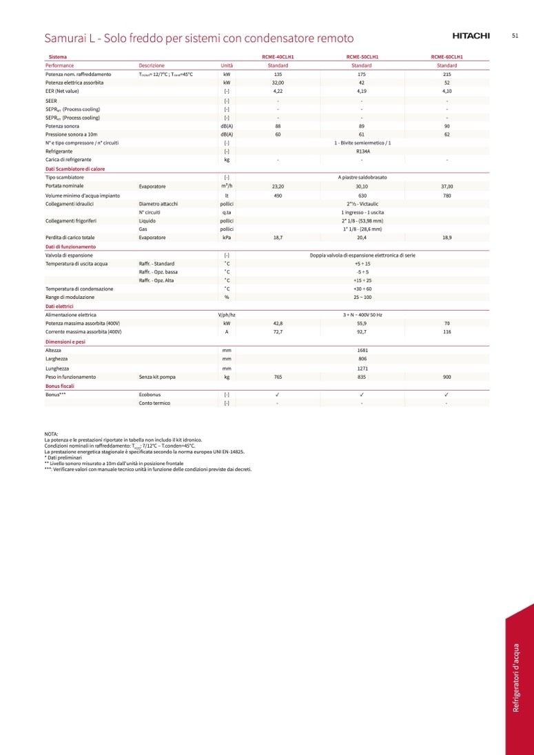 La potenza e le prestazioni riportate in tabella non includo il kit idronico.