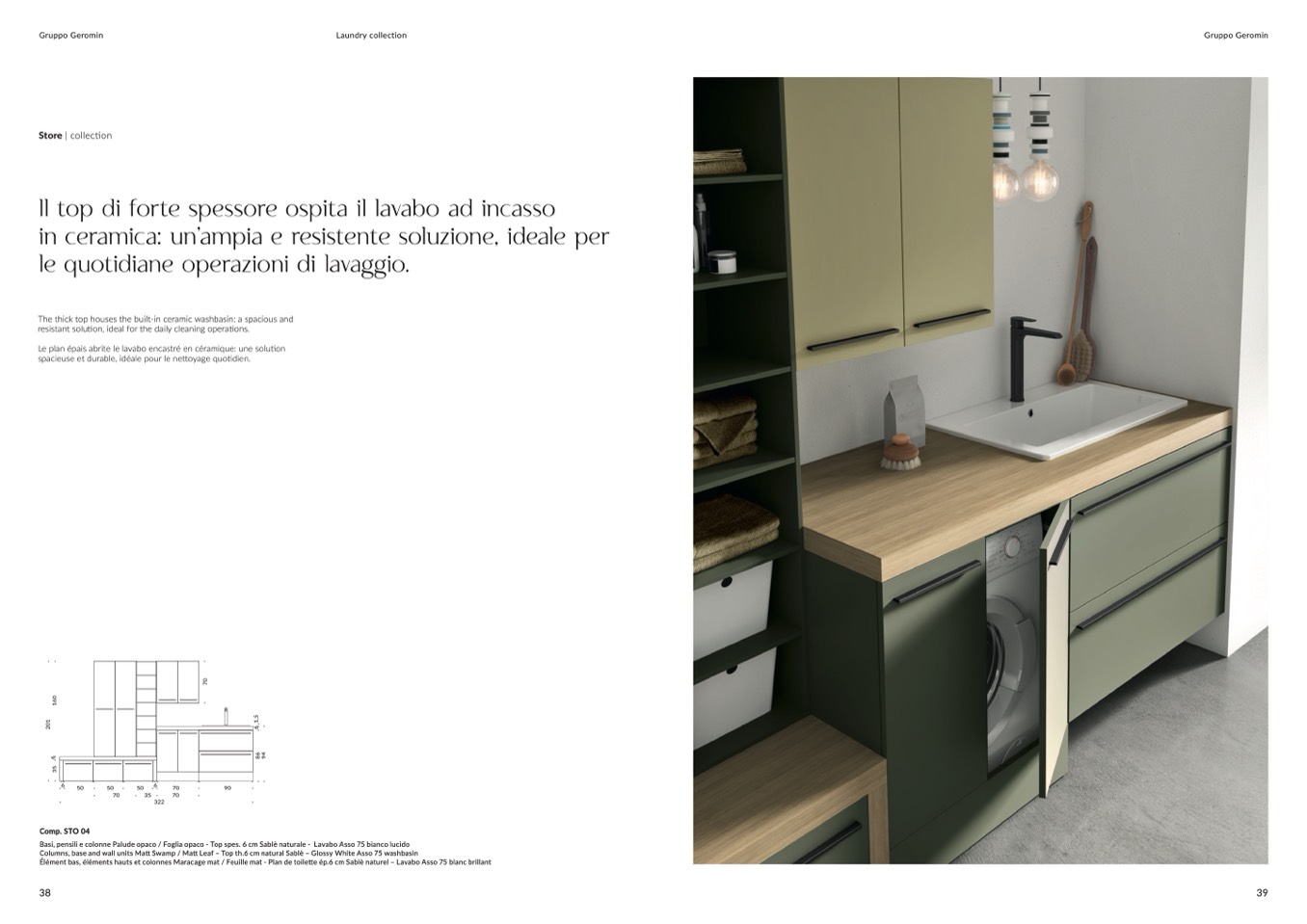 The thick top houses the built-in ceramic washbasin: a spacious and