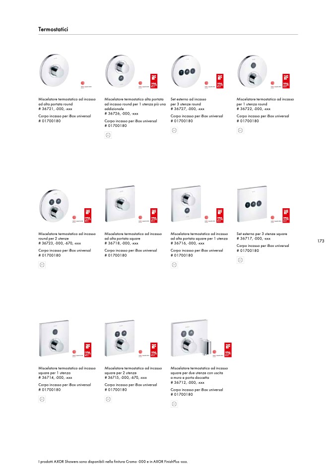 I prodotti AXOR Showers sono disponibili nella finitura Cromo -000 e in AXOR FinishPlus -xxx.