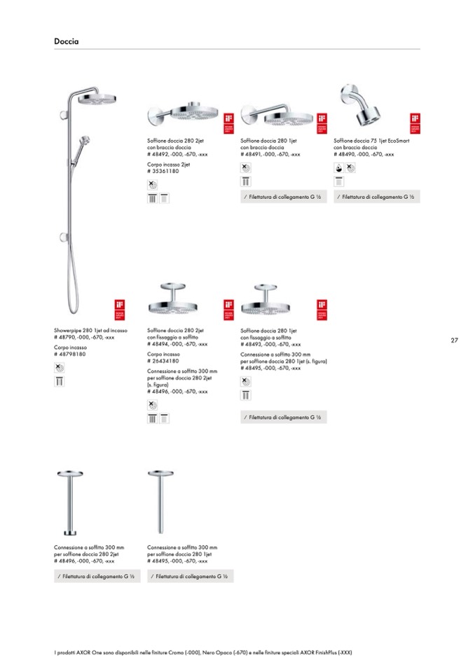 I prodotti AXOR One sono disponibili nelle finiture Cromo (-000), Nero Opaco (-670) e nelle finiture speciali AXOR FinishPlus (-XXX)