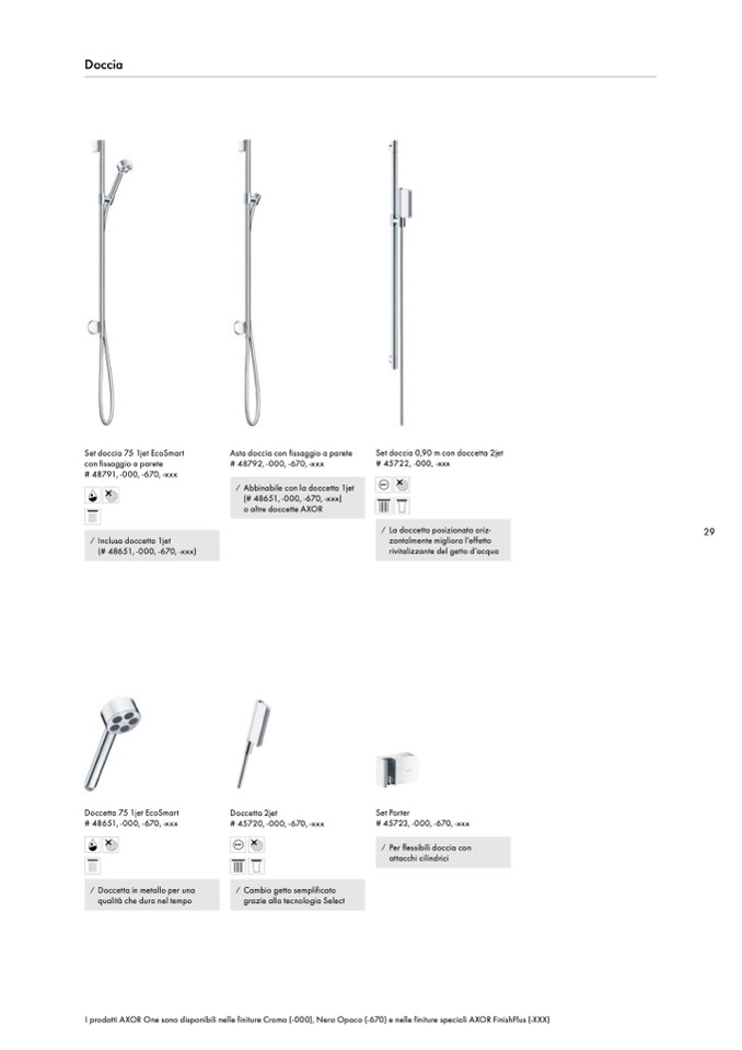 I prodotti AXOR One sono disponibili nelle finiture Cromo (-000), Nero Opaco (-670) e nelle finiture speciali AXOR FinishPlus (-XXX)