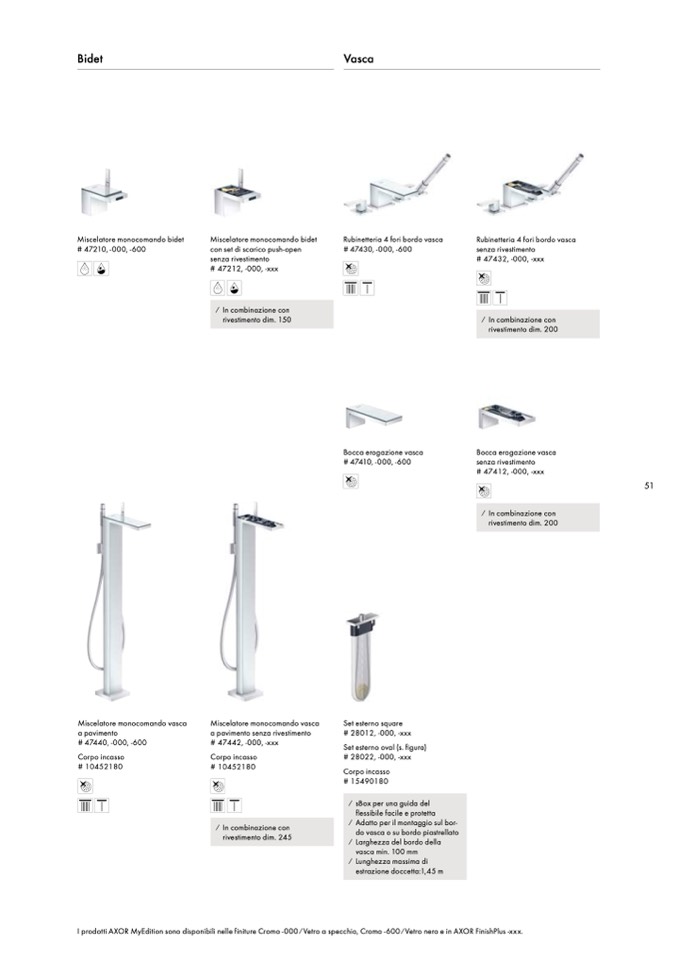 I prodotti AXOR MyEdition sono disponibili nelle finiture Cromo -000 ⁄ Vetro a specchio, Cromo -600 ⁄ Vetro nero e in AXOR FinishPlus -xxx.